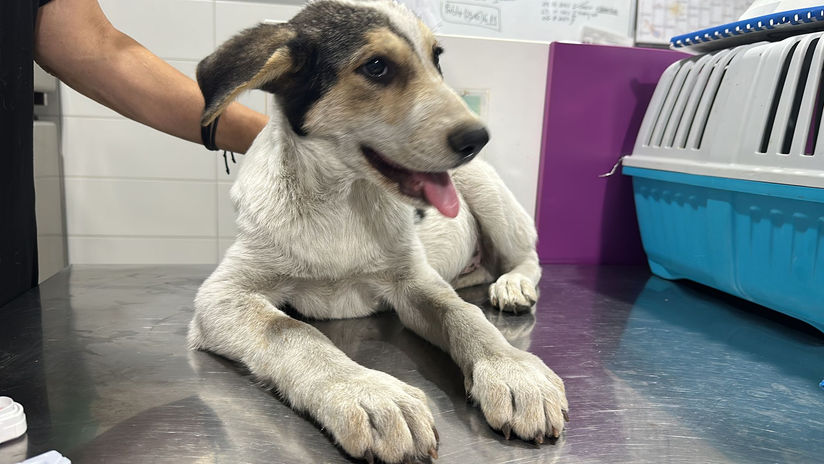 Wenig später hielt genau das Auto vom Tag zuvor an und nahm mich mit. Ich wurde zu einem Mann gebracht, der mich untersuchte, meine Zähne anschaute und mir etwas in den Mund steckte, was gar nicht gut roch. Er piekte mich auch ins Bein – keine Ahnung, warum, ich war doch ganz lieb! Aber er sagte, ich sei gesund, und schon ging die Fahrt weiter. Schließlich hielt das Auto wieder an, und ich hörte lautes Hundegebell. Ich hatte Angst, aber dann entdeckte ich neue Freunde – Asmaa und Lucky, die genauso weiß und getupft sind wie ich!
